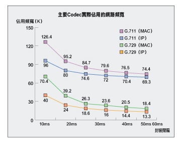 為了儘量減少傳輸延遲,語音籌載的淨值通常都很短,由圖一可看出,IP語音的頻寬吃重,約有66%~80%的頻寬被浪費(深色部份),真正有意義的內容不到只有約20%~33%(淺色部份)。 由圖二計算的結果顯示,8Kb編碼率的G.729,在每20ms取樣一次的條件下(取樣間隔愈短佔用網路頻寬愈高,因每取樣包裝一次就產生上圖中 的浪費(Overhead)),在IP傳輸層傳輸需要24kbps,在實際乙太網路(MAC層)上佔用了高達39.2kbps的頻寬。 若是G.711編碼則更為驚人,在MAC層一路語音就佔用了126.4kbps,在現行以MAC層提供上網服務的ADSL線路上,上行 128Kb,下行1M的產品,就只能勉強傳輸一路語音而已。這結論和許多人的想像不同,也是很多VoIP網路在規畫時就以一路語音8K來計算其所佔用頻 寬,所產生的一大謬誤。 |
