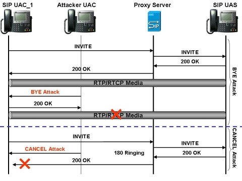 劫持者偵測到SIP UAC和SIP UAS正在通話中,就發送一個偽造來自SIP UAC的BYE訊息給代理伺服器,使代理伺服器誤以為SIP UAC要結束通話了,或是如案例中直接發給一個偽造來自代理伺服器的BYE訊息給SIP UAC,讓SIP UAC誤以為SIP UAS要求結束通話,這就是再見攻擊,通常會讓SIP用戶感覺很困惑,為什麼常常電話一接通、或是講沒幾句話,怎麼莫名其妙掛斷了呢? 取消攻擊的原理和再見攻擊相差不大,如圖(二)下半部所示。劫持者偵測到UAC正試圖和UAS進行通話,就透過發送一個偽造來自代理伺服器的 CANCEL訊息給UAC或UAS,或者反過來偽造一個來自UAC或UAS的CANCEL訊息給代理伺服器,目的是讓代理伺服器誤以為UAC或UAS要取 消剛剛的通話要求,這就是取消攻擊,其效果是讓SIP話機永遠都接不到來電,或是往往電話鈴響一聲就隨即斷了線。 無論再見攻擊或是取消攻擊,都是源自於不嚴謹的程式碼撰寫,大多問題都能用更新軟體或軔體的方式解決。 |